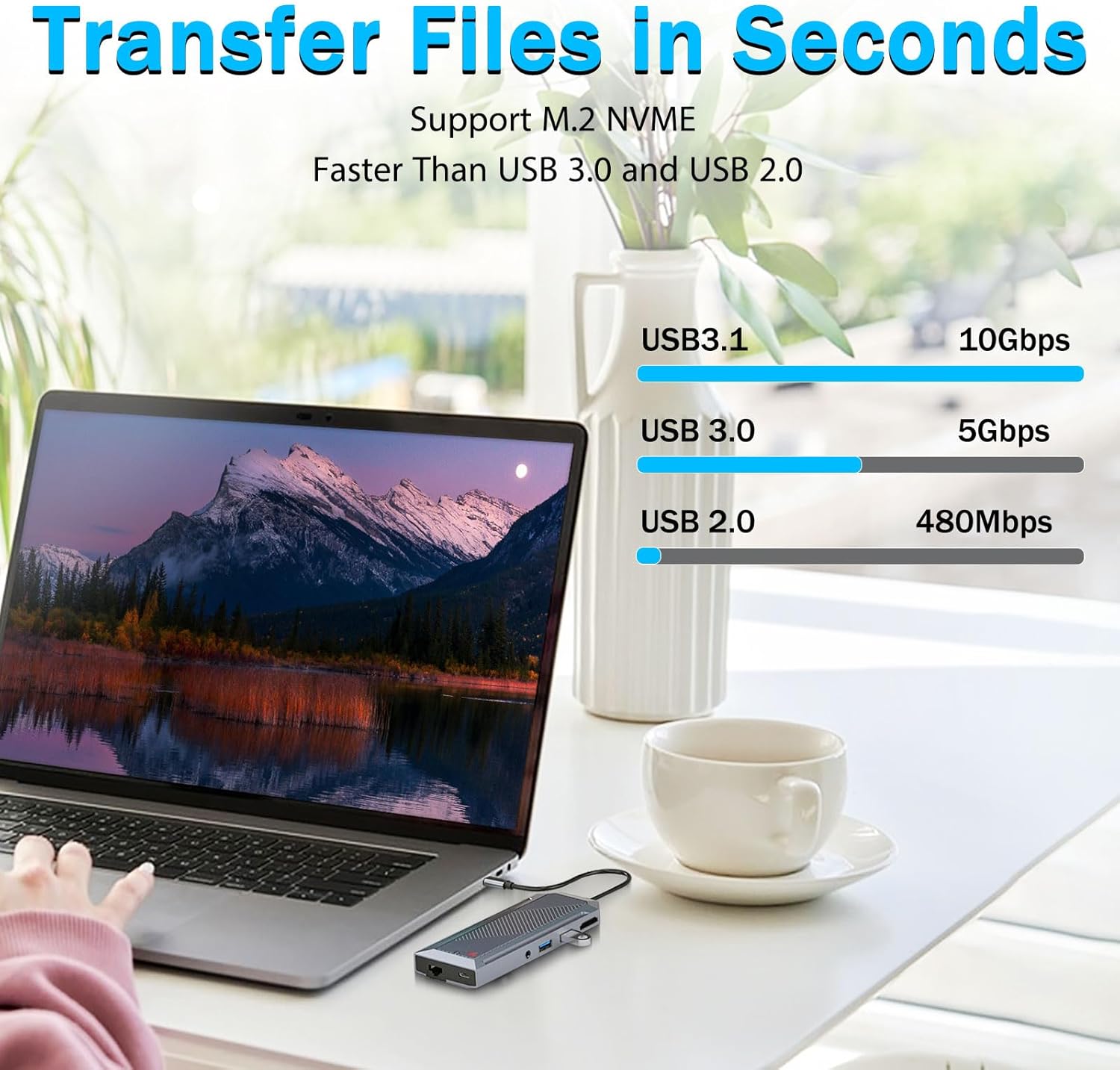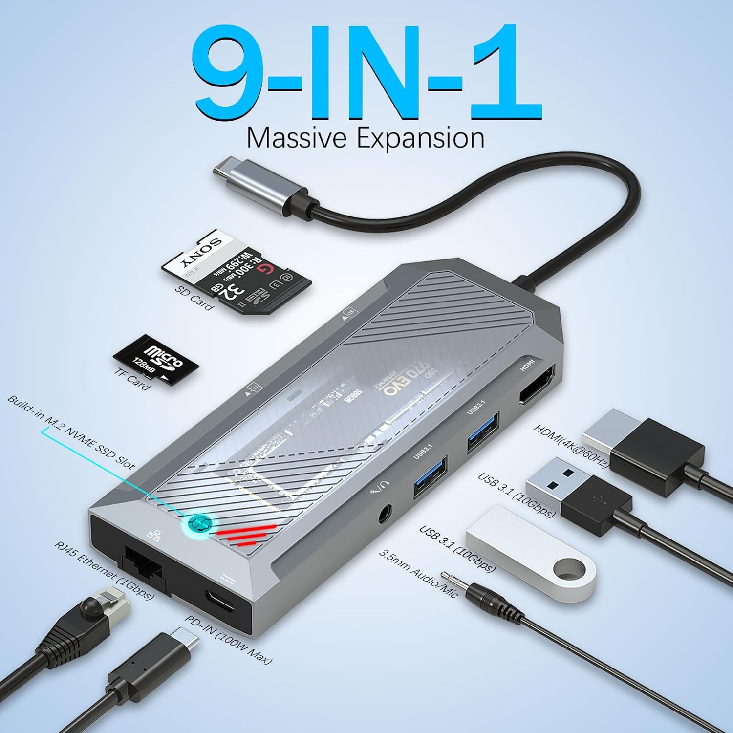 9-у-1 УСБ-Ц чвориште са ССД кућиштем за М.2 НВМе 4К 60Хз ХДМИ разделник – врхунско повезивање и проширење складиштења великом брзином