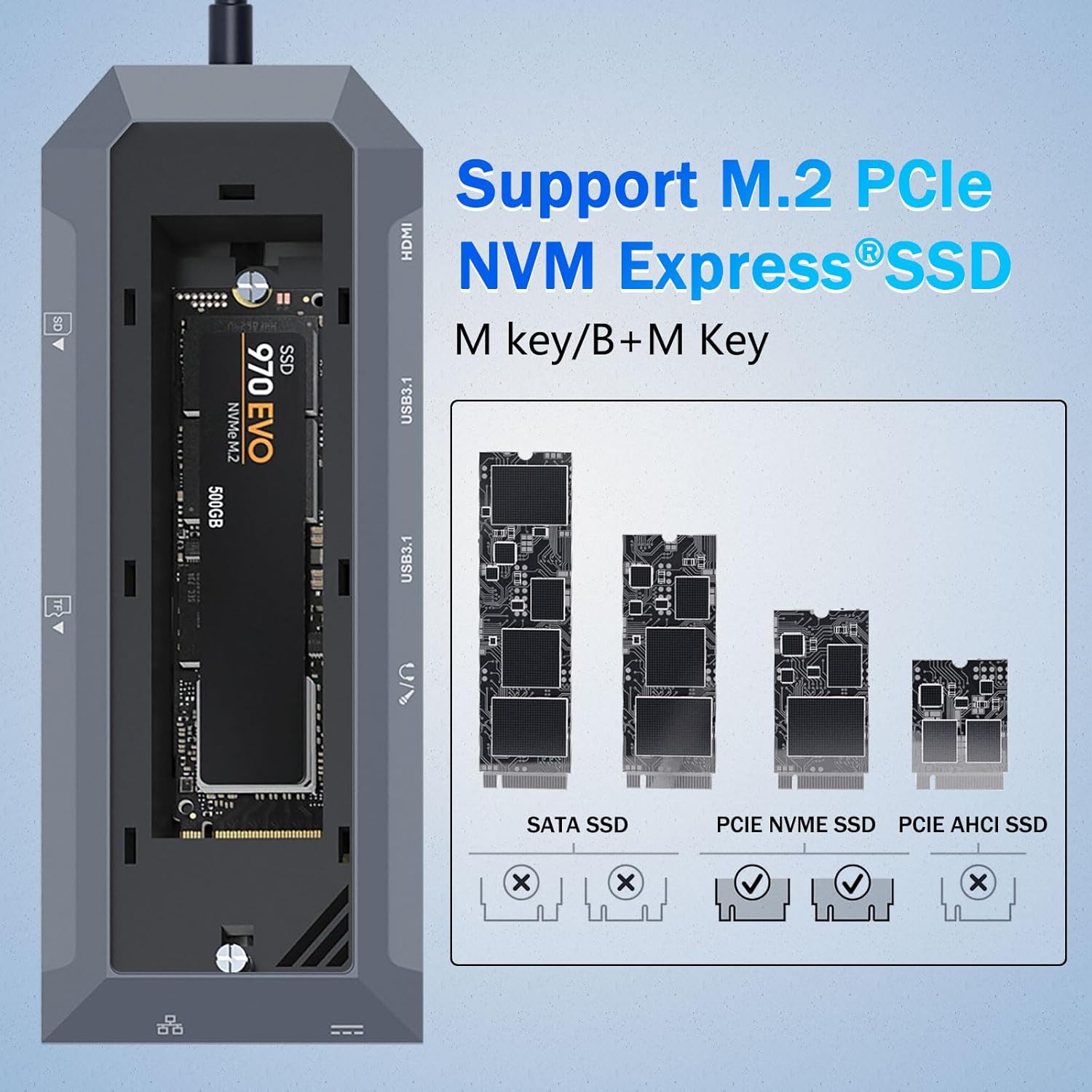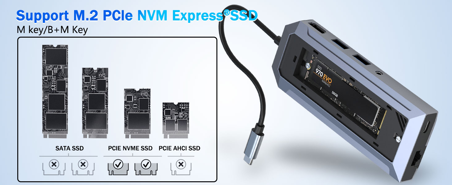 За разлику од традиционалних УСБ чворишта, овај уређај укључује наменско ССД кућиште које подржава М.2 НВМе ССД уређаје. Ова функција омогућава корисницима да додају складиште велике брзине директно у свој радни простор без потребе за посебним екстерним диском.