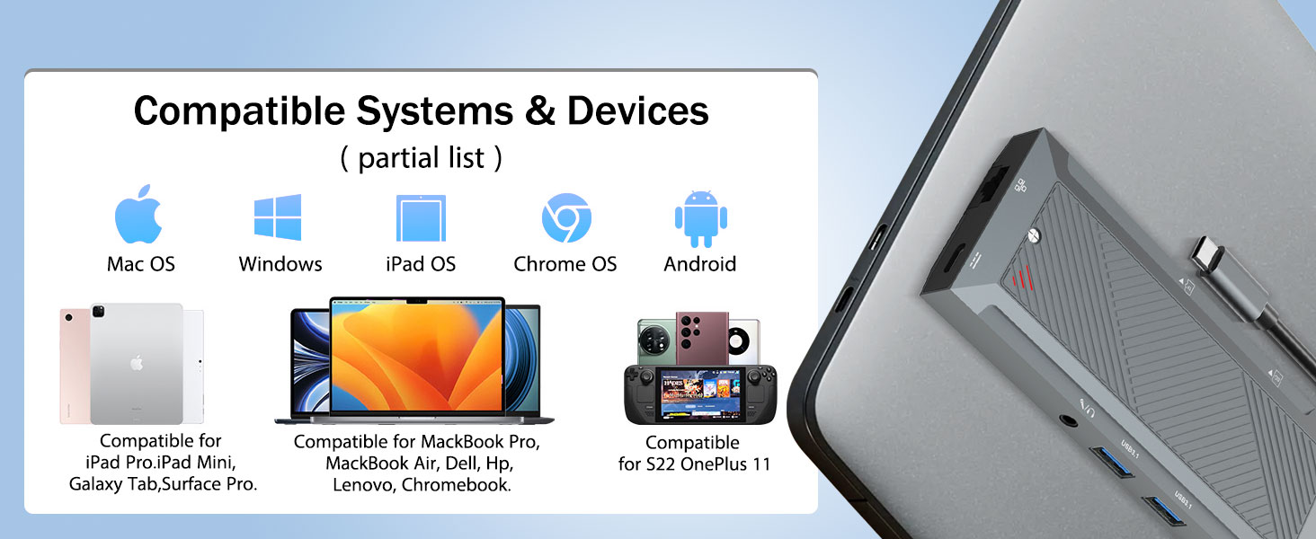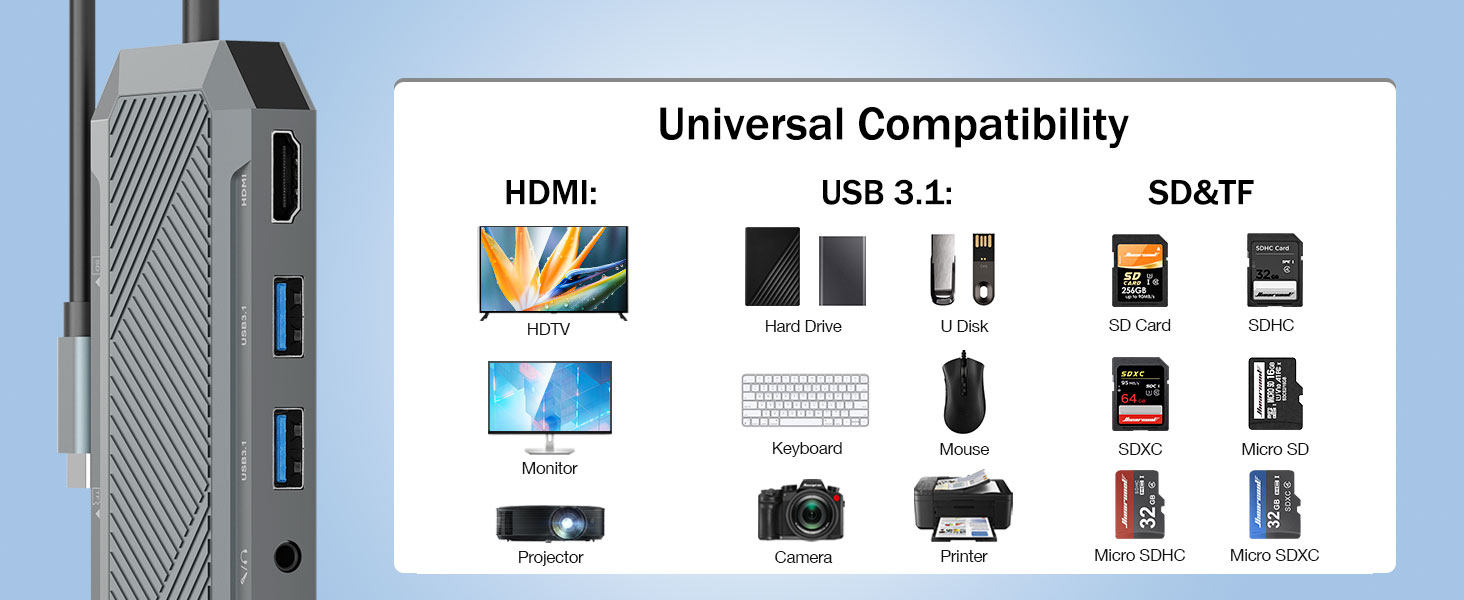 Модерни лаптопови и таблети постају све моћнији и преносивији, али многи уређаји жртвују основне портове у корист тањег дизајна. Као резултат тога, професионалци, креатори и свакодневни корисници често захтевају свестрано решење за повезивање које проширује могућности уређаја без угрожавања перформанси. 9-у-1 УСБ-Ц чвориште са ССД кућиштем за М.2 НВМе 4К 60Хз ХДМИ разделник пружа све-у-једном решење које комбинује пренос података велике брзине, ултра јасан излаз на екрану и интегрисану ССД функционалност за складиштење.