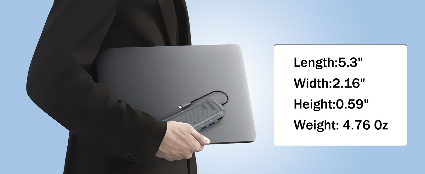 Упркос својој моћној функционалности, 9-у-1 УСБ-Ц чвориште са ССД кућиштем за М.2 НВМе 4К 60Хз ХДМИ разделник је дизајниран да остане компактан и лаган. Ово олакшава ношење у торбама за лаптоп, ранчевима или путним торбама.