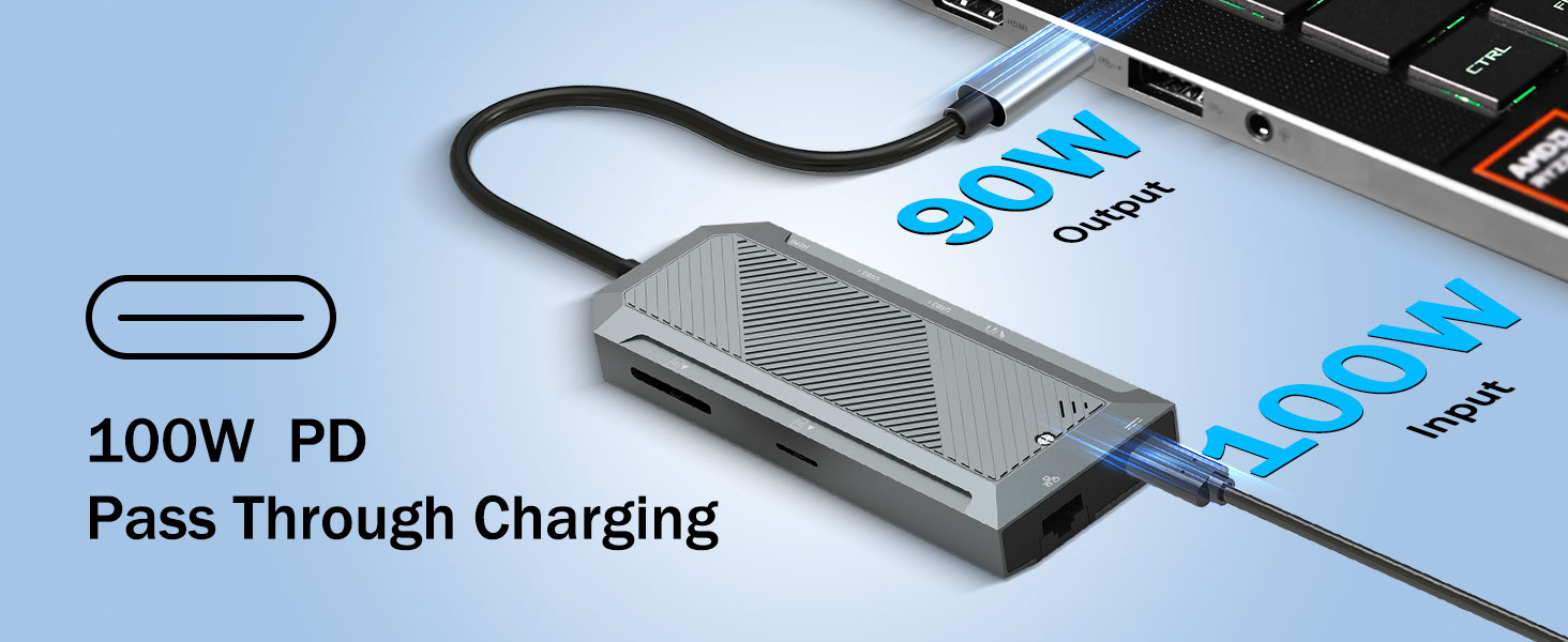 Подршка за испоруку енергије осигурава да уређаји остану напуњени док је чвориште у употреби. УСБ-Ц ПД порт омогућава да струја прође кроз чвориште до повезаног лаптопа или таблета.