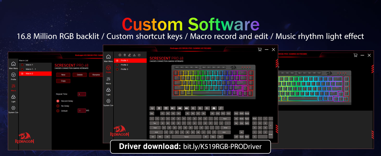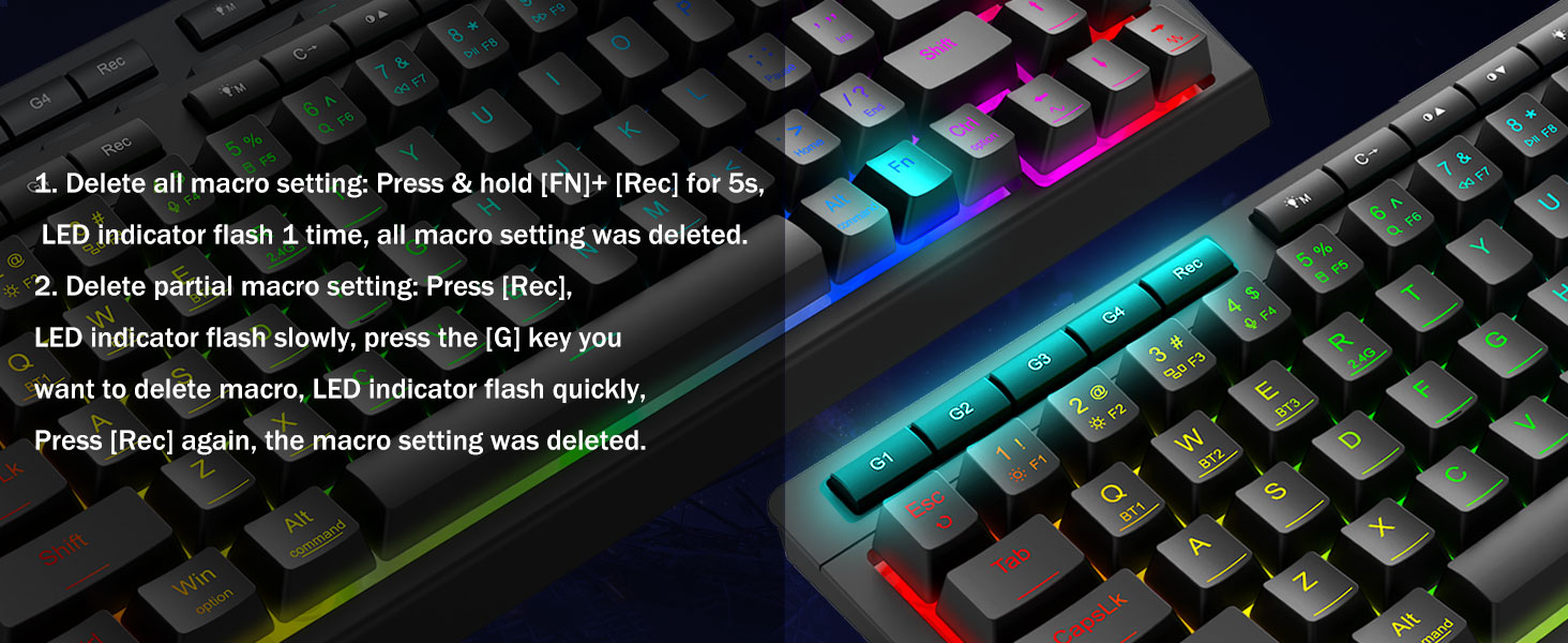 Прилагодљиви макрои, контрола без напора -Програмирајте 4 уграђена макро тастера (Г1-Г4) тренутно—није потребан софтвер. Снимите сложене комбинације за играње игара, пречице за продуктивност или медијске команде. Редефинишите свој ток рада за секунде. Такође можете да користите софтвер за прилагођавање функција, креирање макроа, подешавање РГБ светла и подешавање пречица. Веза за софтвер: бит.ли/К524РГБ-ПРОДривер