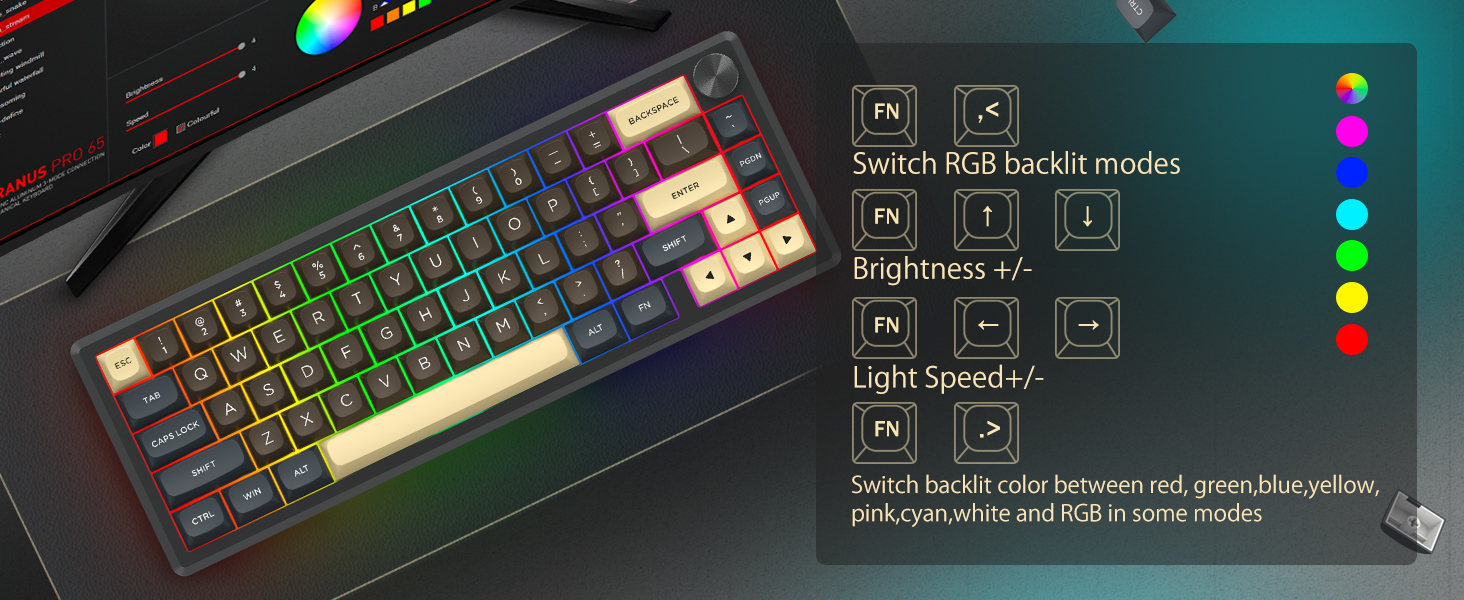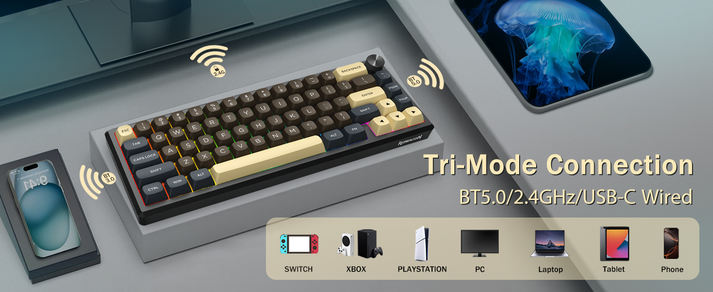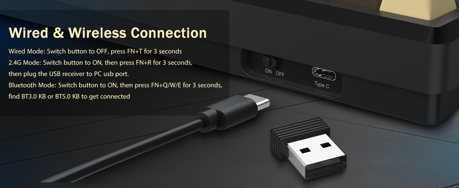 Тастатура подржава бежично повезивање за практичност и жичану УСБ везу за стабилне перформансе. Корисници могу да прелазе између режима у зависности од њиховог подешавања.
