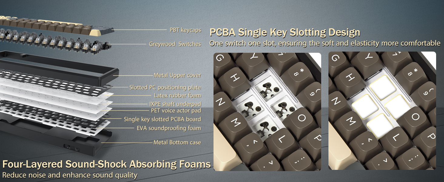 Поклопци тастера су дизајнирани за издржљивост и конзистентну текстуру, помажући да се током времена одржи удобно искуство куцања. Оквир тастатуре обезбеђује стабилност током употребе, смањујући кретање током куцања или играња.