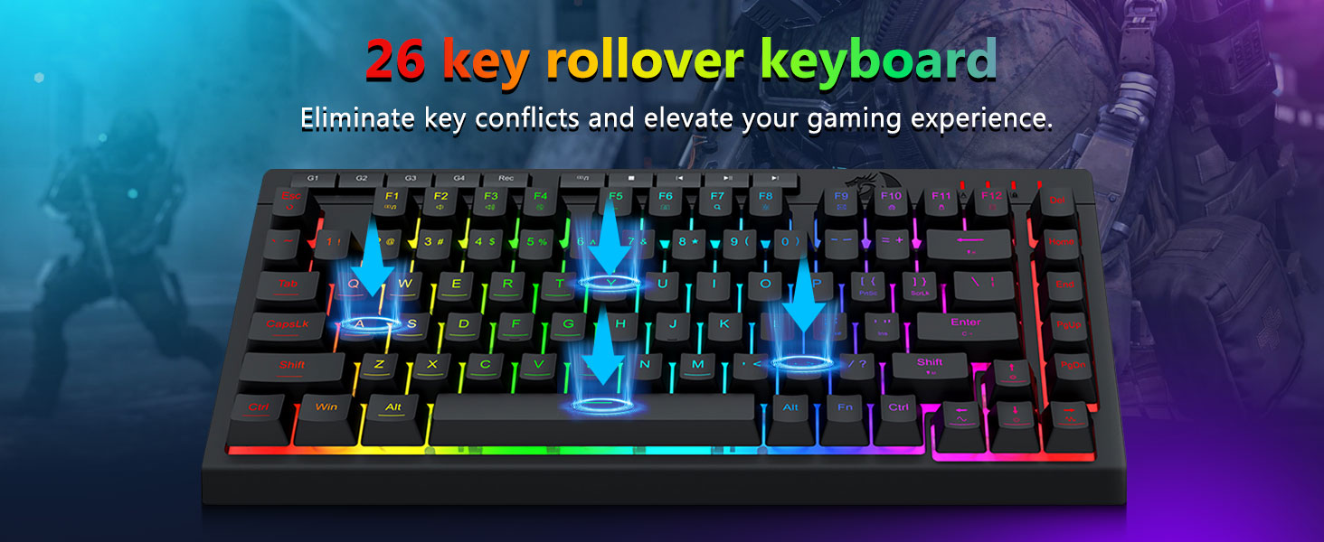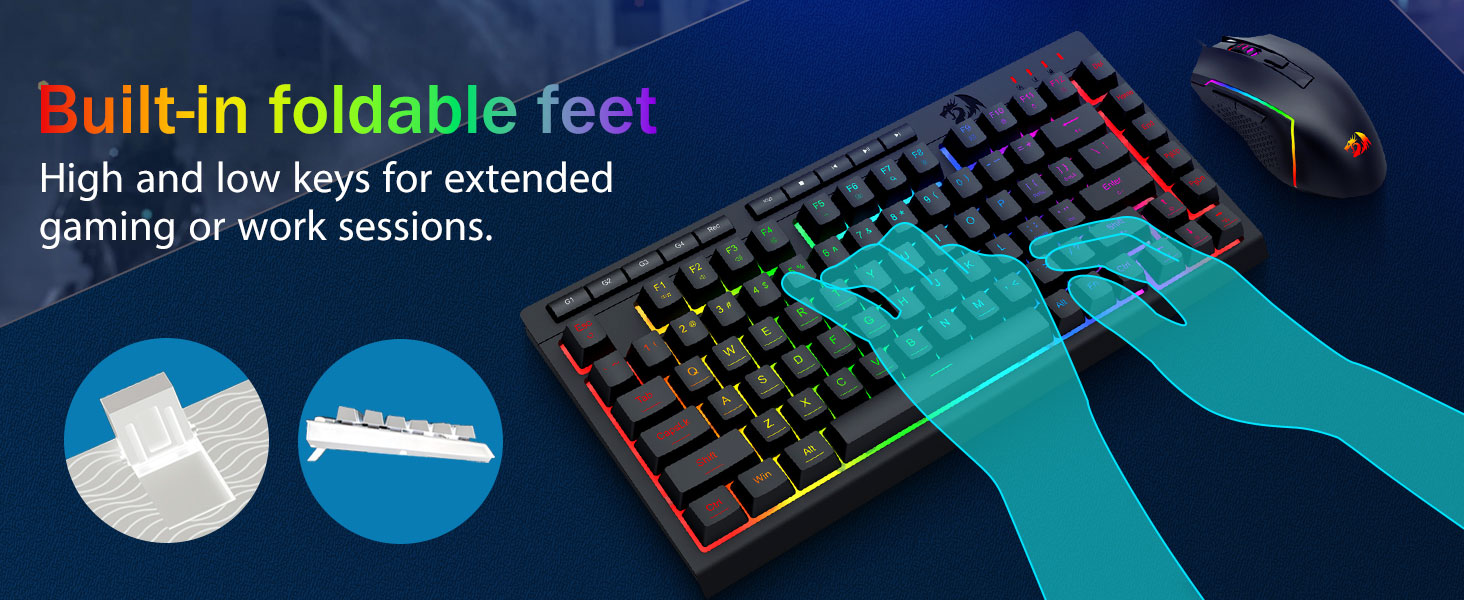 【Удобно играње】Склопиво постоље тастатуре, премаз погодан за кожу и плутајуће капице за тастере повећавају удобност куцања. 26 тастера Анти-гхостинг осигурава да се свако дугме може активирати. ВИН кључ се може онемогућити за играње. Ова тастатура и миш су посвећени пружању ефикасног искуства играња док обезбеђују максималну удобност