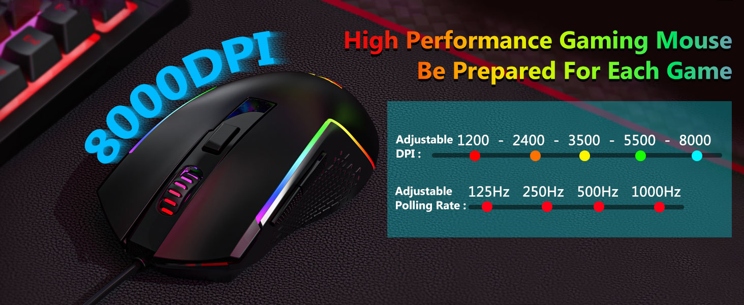 【Професионални миш за игре】Можете подесити ДПИ од 1200 до 8000 преко дугмета ДПИ или од 100 до 8000 преко софтверског драјвера да бисте лако задовољили своје различите потребе у игрицама или послу. Укупно 7 дугмади од којих је 6 програмабилно. Сензор високе прецизности пружа прецизну тачност, док микро прекидачи за играње обезбеђују дуговечност, већу издржљивост и екстремни одзив, дајући вам још већу предност у односу на конкуренцију. (Софтвер такође подржава подешавање брзине прозивања миша до 1000Хз)