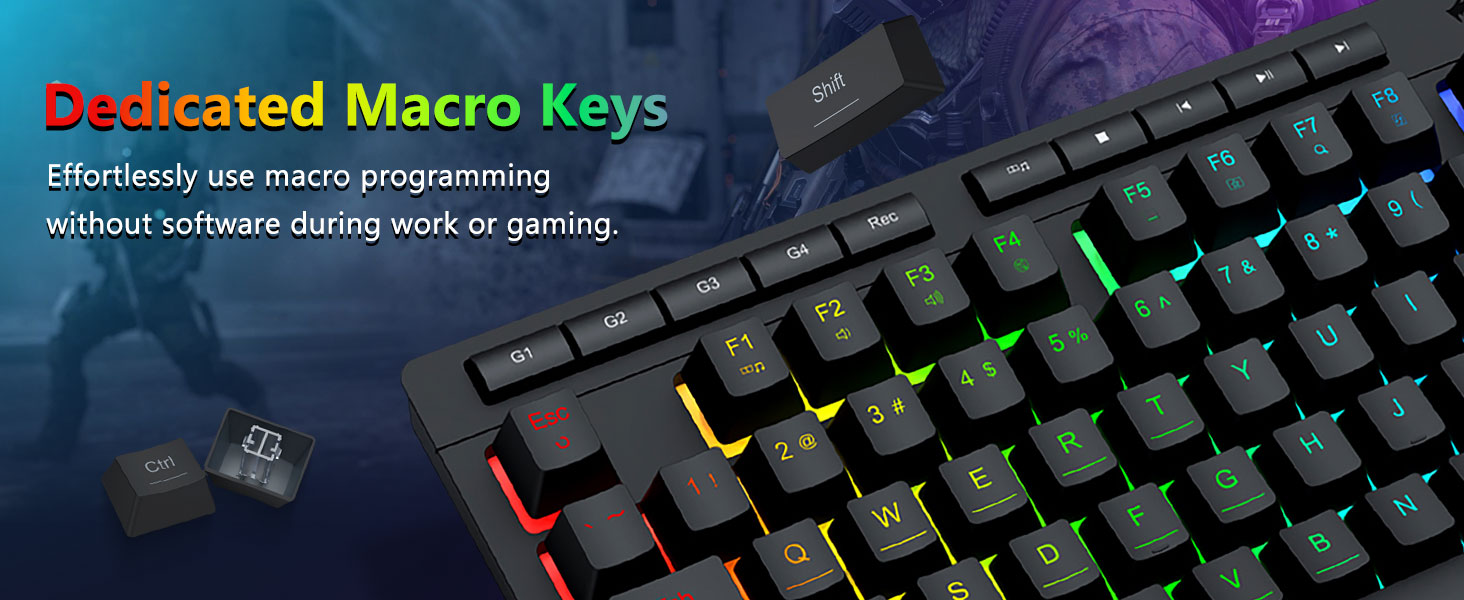 【Ефикасан и згодан】Ова комбинација тастатуре и миша за игре је опремљена са 4 уграђена макро тастера, 5 независних мултимедијалних тастера и 12 ФН мултимедијалних функцијских тастера, једноставних и практичних за руковање. Не само да побољшава ефикасност, већ и чини ваш процес играња практичнијим и бржим