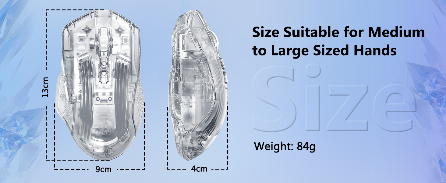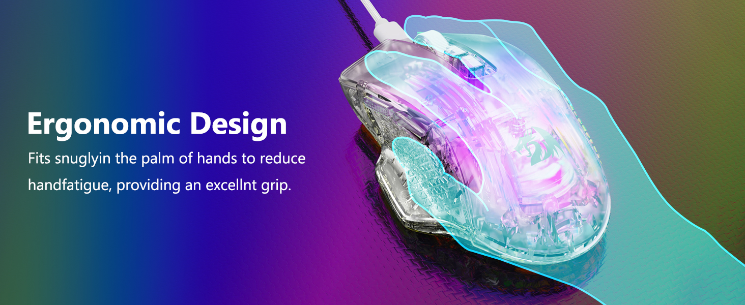 Миш је обликован тако да природно лежи у руци, подржавајући продужену употребу без претераног напрезања. Његова структура омогућава удобне стилове хватања, укључујући држање дланова, канџи и врхова прстију.